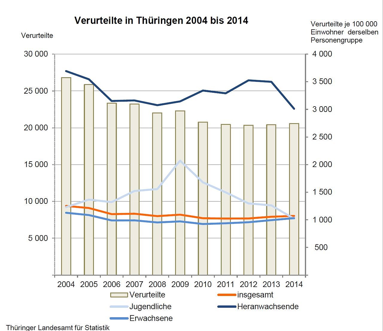 An den Thüringer Gerichten wurden im Jahr 2014 insgesamt 20 577 Personen schuldig gesprochen. Wie das Thüringer Landesamt für Statistik mitteilt, ist die geringe Steigerung der Verurteiltenzahlen von 0,8 Prozent gegenüber dem Vorjahr ausschließlich auf die Altersgruppe der Erwachsenen zurückzuführen...