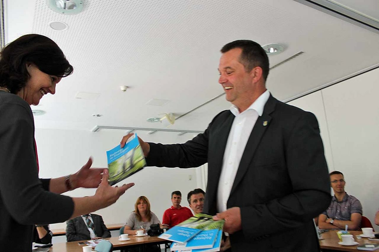 Vertreter von Ingeniuerbüro, Baufirma und auch anliegender Kommunen, Sondershausens Bürgermeister Joachim Kreyer und Ortsteilbürgermeisterin Gudrun Oesterheld, waren ebenfalls erschienen. Neben dem Fahrrad hatte er eine neue Radwegkarte des Freistaats Thüringen dabei.