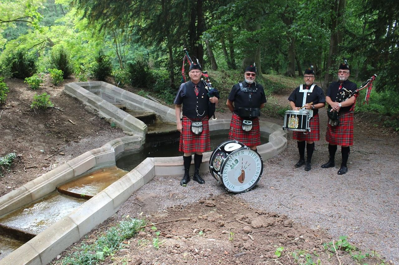 Das jüngst wiederhergestellte Römische Bad wurde heute im Rahmen des Festakts eingeweiht. Hier präsentieren sich allerdings Pipes & Drums, die mit ihrem Einmarsch das Fest eröffneten