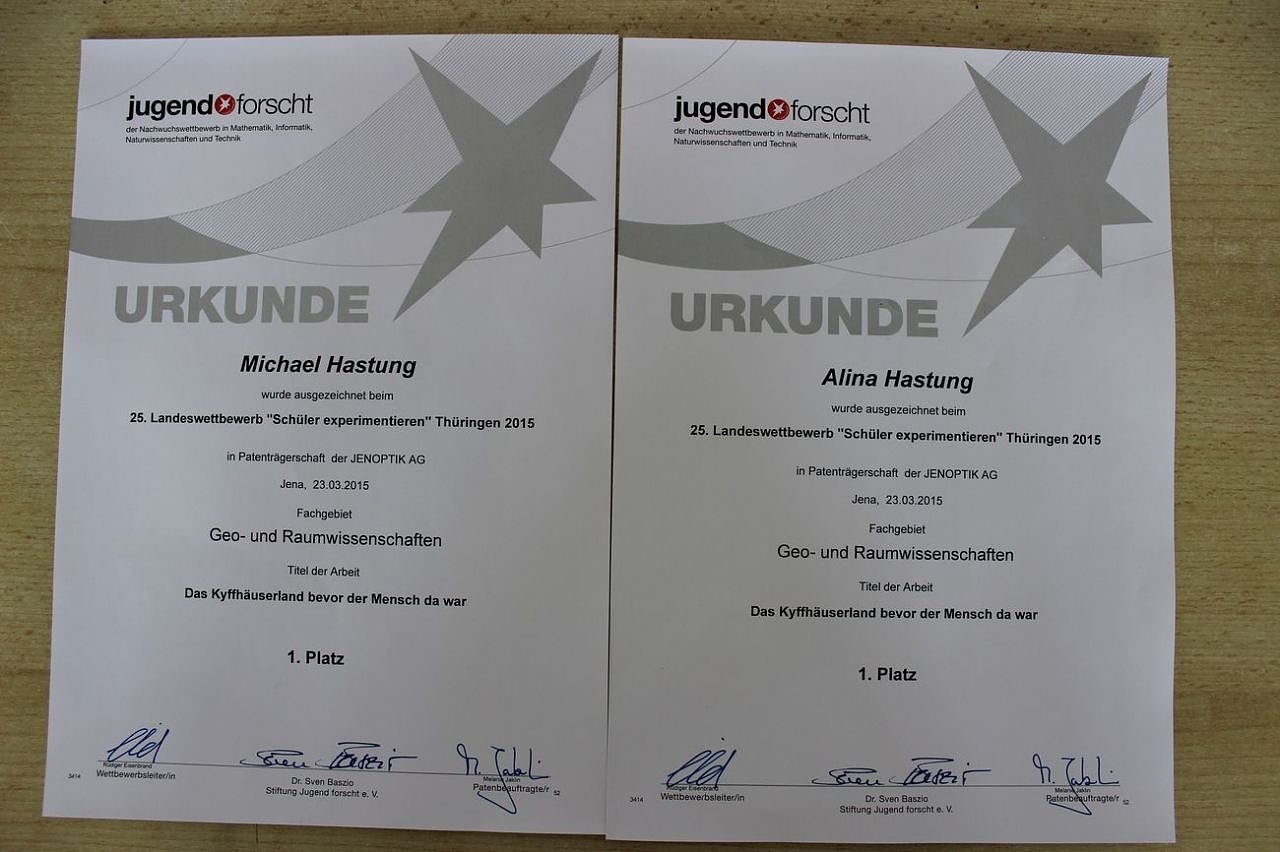 Dort belegte es im Fachgebiet Geo- und Raumwissenschaften den 1. Platz. Erarbeitet wurde das Projekt von den Geschwistern Alina Hastung (10 Jahre - Grundschule Kyffhäuserland Rottleben) und Michael Hastung (12 Jahre - Kyffhäuser-Gymnasium Bad Frankenhausen). Als Sonderpreis gab es noch ein Jahresabonnement der Zeitschrift "Spektrum der Wissenschaft".