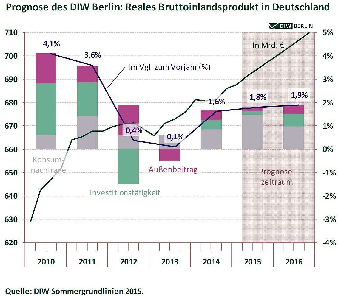Marcel Fratzscher (Präsident des DIW Berlin): Die deutsche Wirtschaft erscheint derzeit stärker, als sie tatsächlich ist. Ein Plus beim Bruttoinlandsprodukt von 1,8 Prozent klingt auf den ersten Blick gut, doch dahinter stehen zahlreiche Sonderfaktoren wie der niedrige Ölpreis oder der für die deutschen Exporteure günstige Euro-Wechselkurs. Die Risiken sind hingegen enorm: Ein Scheitern der Verhandlungen mit Griechenland und ein Austritt des Landes aus dem Euro hätte fatale Folgen für Europa und würde somit auch der deutschen Wirtschaft schaden. Das Risiko von Ansteckungseffekten der Griechenlandkrise dürfen wir nicht unterschätzen. Auch wegen dieser Unsicherheiten investieren die Unternehmen noch immer viel zu wenig und haben bisher nicht einmal das Vorkrisenniveau erreicht.Ferdinand Fichtner (Leiter der Abteilung Konjunkturpolitik): Die Weltwirtschaft nimmt nach einem unerwartet schwachen Auftaktquartal wieder Fahrt auf. Dabei sind es vor allem die Industrieländer, die den Konjunkturmotor ankurbeln, weil die Verbraucher dort wegen geringer Inflationsraten und einer verbesserten Situation auf dem Arbeitsmarkt mehr Geld in der Tasche haben und dieses größtenteils auch ausgeben. Wichtige Schwellenländer wie China wachsen hingegen strukturell und konjunkturell bedingt immer langsamer – das könnte auch die deutschen Exporte belasten. Positiv ist aber, dass sich die Konjunktur im Euroraum zunehmend aufhellt. Dabei darf man aber die Risiken rund um Griechenland keinesfalls außer Acht lassen.
