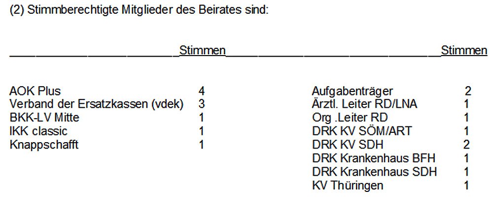 Um die gesetzlich geforderte Stimmparität zwischen den Kostenträgern und den anderen Beteiligten am Rettungsdienst wieder herzustellen, erhält der DRK-Kyffhäuserkreisverband Sonderhausen e.V. eine weitere Stimme.