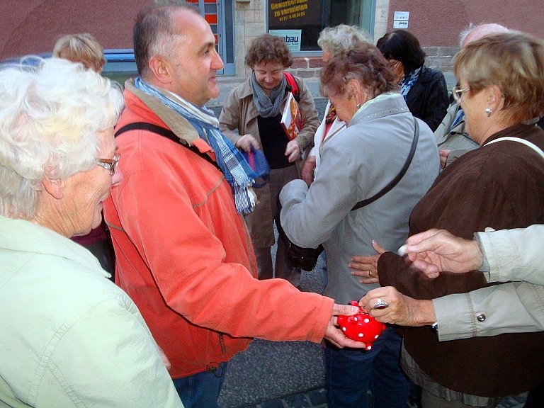 Selbst mancher Einheimische erfuhr durch diesen informativen Rundgang diverse Einzelheiten der Heimatgeschichte. Am Ende dieses Außentermins (eingebettet im Veranstaltungsreigen 800 Jahre Kirche an diesem Platz) dankte Pfarrerin Magdalena Seifert für den so lebendig angelegten Stadtrundgang und die etwa 50 Beteiligten zeigten sich spendabel, als Dr. Hahnemann das Museums-Sparschweinchen zückte und um eine Spende für die Restaurierung der Bleiglasfenster Bauernkrieg im Regionalmuseum bat. Da wurde freudig gegeben!