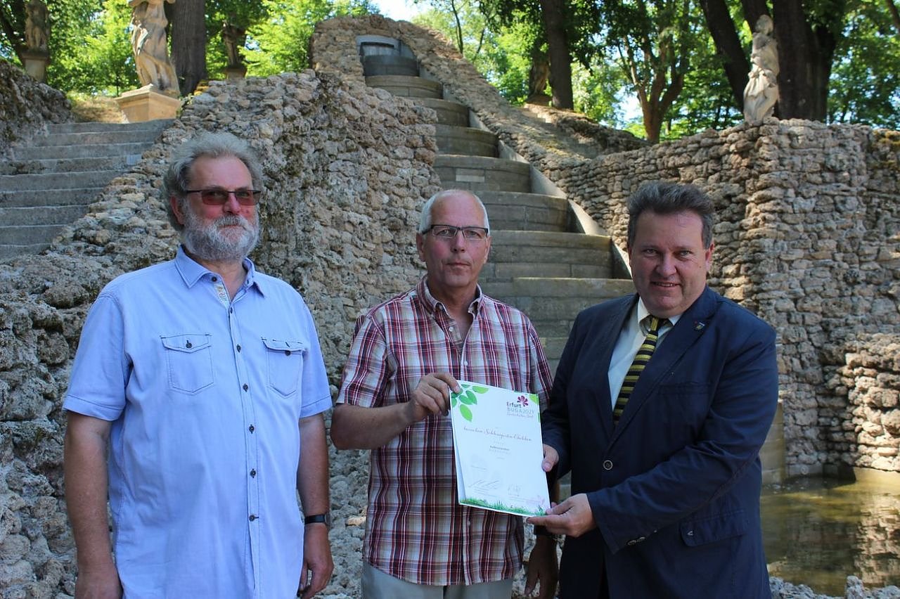 Dazu hatte Bürgermeister Uwe Vogt die Fördermittelgeber, Planer, Bauleute, Helfer und Sponsoren der vergangenen zweieinhalb Jahre eingeladen. Die Deutsche Stiftung Denkmalschutz, die durch ihren Ortskurator Mühlhausen Hans-Ulrich Pohlmann vertreten ist, stellte 2012 und 2013 insgesamt 20.000 Euro für die Mauerwerkssanierung der Hauptattraktion in der barocken Gartenanlage zur Verfügung.