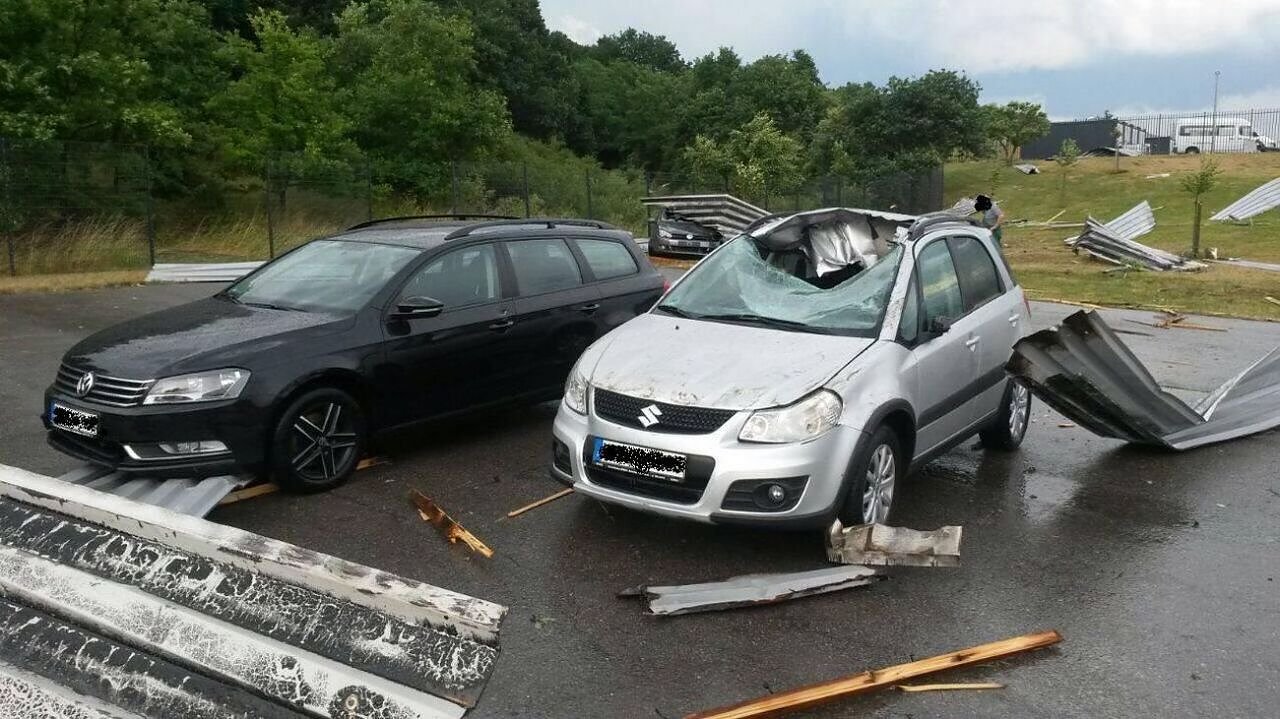Autor: khhStarkregen und Sturmböen rissen wohl ein Blechdach ab und beschädigte die PKWs. Fotos privat.