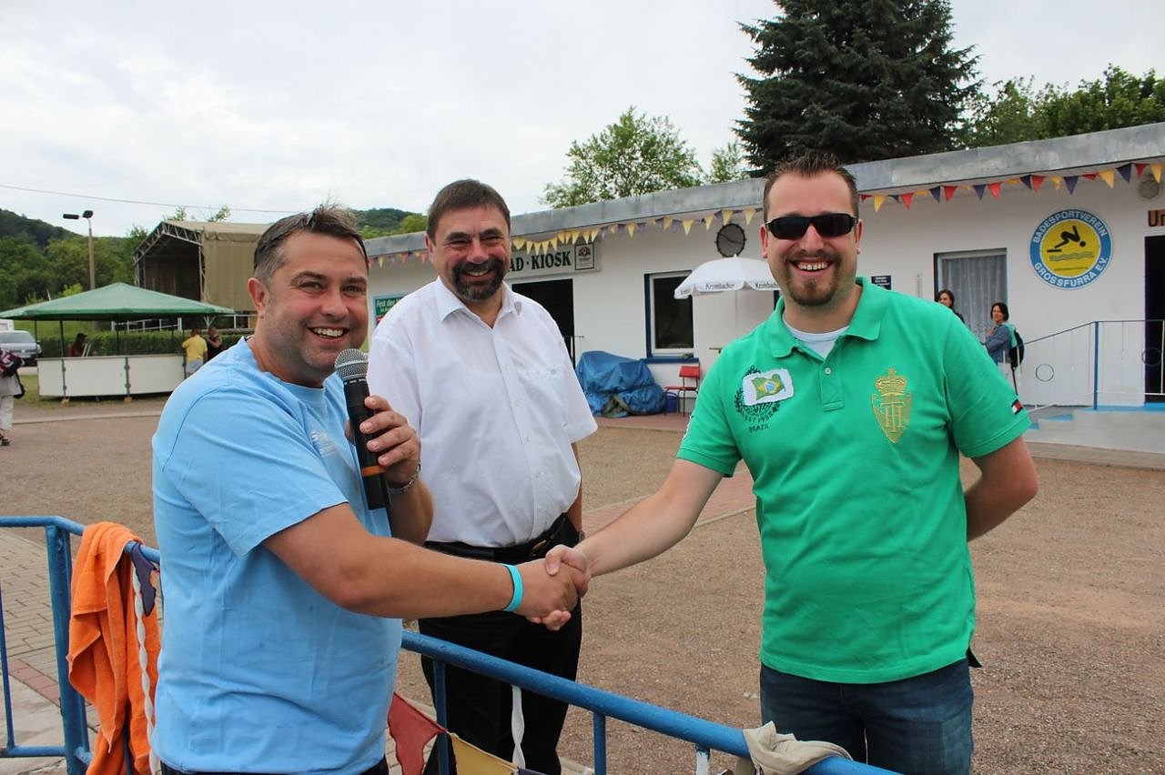 Noch immer steht als hehres Ziel die 500 km- Marke zu durchbrechen und das könnte bei diesen Temperaturen auch zu schaffen sein. Aber noch besser, per Handschlag begrüßt Markus Töppe Martin Ludwig (re.) von der Fraktion der Volkssolidarität im Stadtrat von Sondershausen. Die Fraktionsmitglieder haben ihre Sitzungsgelder gesammelt und sponsern jeden geschwommenen Kilometer mit einem Euro.
