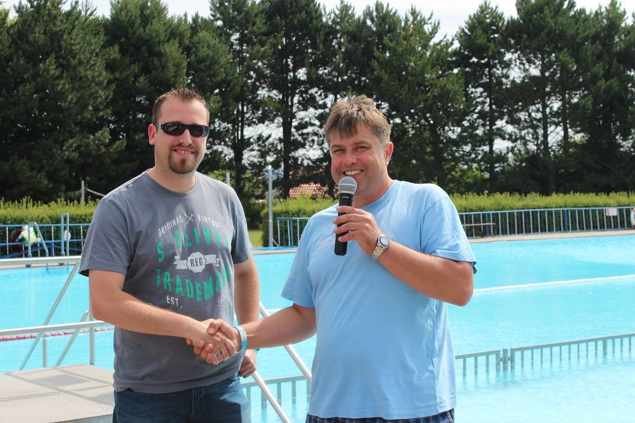 Martin Ludwig (li.) vom Hauptsponsor (Fraktion der Volkssolidarität im Sondershäuser Stadtrat) bekam den Dank von Markus Töppe. Die 6.224 geschwommenen Bahn sind 311,2 km und damit kamen 311,20 Euro von der Volkssolidarität an den Badesportverein. Dieses Geld kommt aus dem Topf der gespendeten Sitzungsgelder der Stadtratsmitglieder der Fraktion. Damit wollen wir gute und sinnvolle Vereinsarbeit fördern, so dass Stadtratsmitglied Martin Ludwig. Das Freibad in Großfurra ist ein Mehrgewinn für die Region und es lohnt sich, sich für den Erhalt dieser Freizeitstätte einzusetzen.