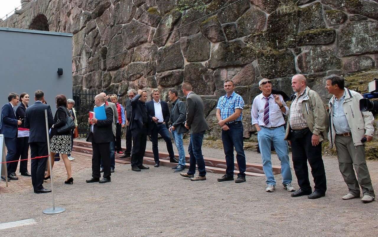Nicht nur kn war es aufgefallen: Während die Prominenz Beifall für den neuen Eingangsbereich klatschte, mussten Radtouristen ihre beiden Mountainbikes an ein Bäumchen im Rücken des klatschenden Publikums anbinden, siehe Pfeil (es war nicht kn).