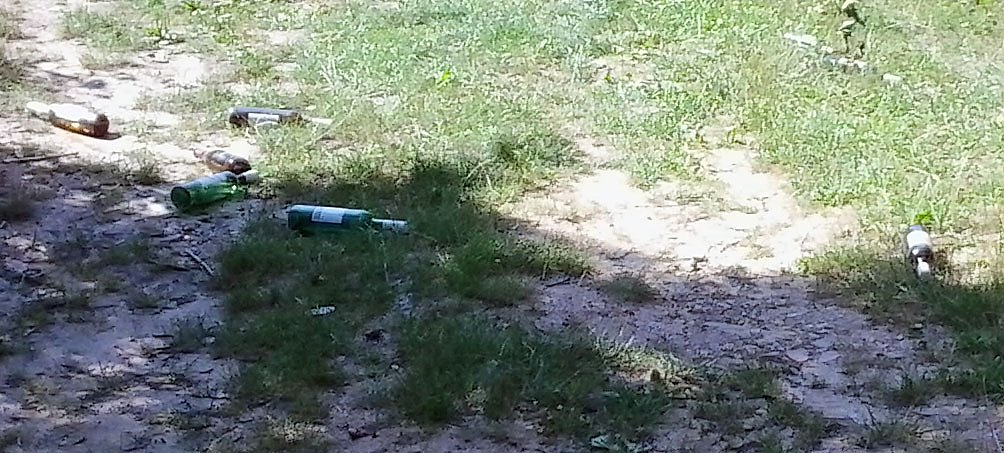 Weinflaschen über Weinflaschen lagen da rum. Alle passten nicht aufs Foto. In Summe wurden allein 18 Flaschen zusammen gelesen. Rund um die in der Nähe stehende Sitzgruppe lagen Unmengen von Papiertaschentücher achtlos zu Boden geworfen.