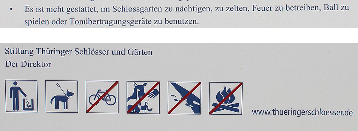 Und haben Sie das oben gelesen? Die Benutzung von Tonübertragungsgeräten im Schlosspark ist nicht gestattet. Dazu zählen ganz streng genommen auch Smartphones und Tablets.