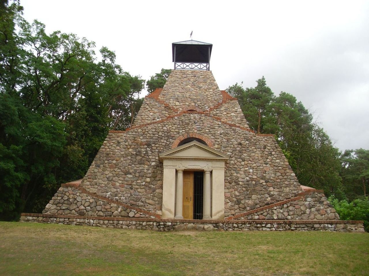 Würden Sie bei Berlin mitten im Wald eine Pyramide vermuten? Wir bisher auch nicht und Ägypten ist sehr weit weg. In Garzau, einem kleinen Ort mit ehemaligem Grafensitz gab und gibt es sie in einer Landschaftsgartenanlage des Friedrich Wilhelm Carl Graf zu Schmettau (1743 – 1806). Hier war sie als zentraler Punkt des Landschaftsgartens angelegt worden. Leider ist vieles von diesem Landschaftsgarten so nicht mehr erhalten geblieben. Aber die Pyramide, ursprünglich auch als besondere Begräbnisstätte errichtet, steht genau hier. Aus der Bestattung in dieser Pyramide wurde nichts, das Bauwerk verfiel zwischenzeitlich und wurde ab 2001 durch den Verein Pyramide und Schlosspark Garzau e. V. wieder aufgebaut. Am Hang vor der Pyramide wurden zwischenzeitlich auch wieder Rebstöcke (Wein) angepflanzt.