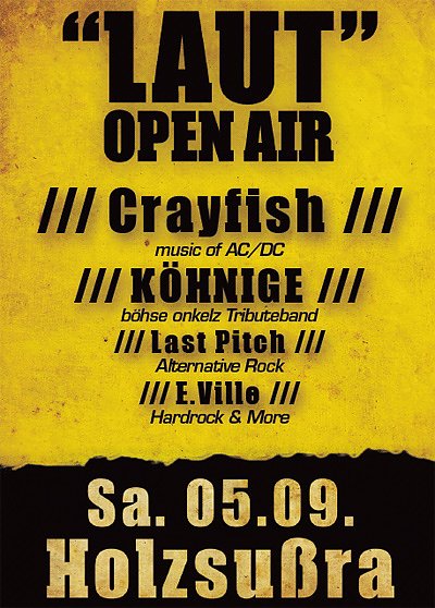 Liebe Freunde des "LAUT" Open Air. Es wird wieder LAUT am Samstag. Hier kn mit den Einzelheiten...Opener werden dieses Jahr E.Ville sein. Die Jungs bieten Hardrock and More aus der Landeshauptstadt Erfurt.
