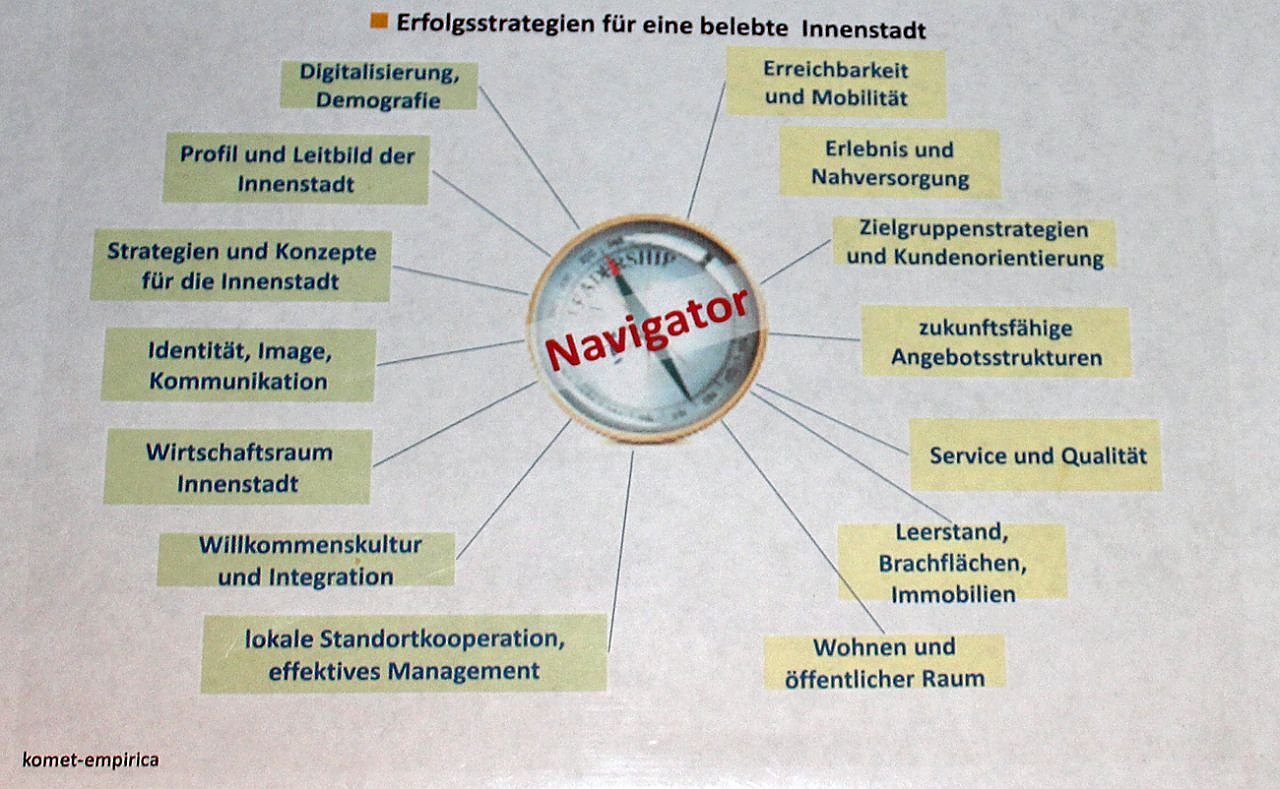 Die rasante Entwicklung im Handel ist eine Herausforderung, die die Einzelhändler oft nicht mehr allein bewältigen können. Auch die Gastronomen, Gewerbetreibenden, Dienstleister, die Grundstücks- und Hauseigentümer bis hin zur Stadtverwaltung müssen ins Boot geholt werden und dieser Aufgabe stellt sich auch Dr. Hardo Kendschek Geschäftsführer der komet-empirica GmbH, Leipzig, in in den letzten Woche getrennte Gespräche mit Gewerbetreibenden und Stadtverwaltung geführt hat, dabei wurden eben Problemkreis, wie ticken die Kunden usw. untersucht, siehe Bild.