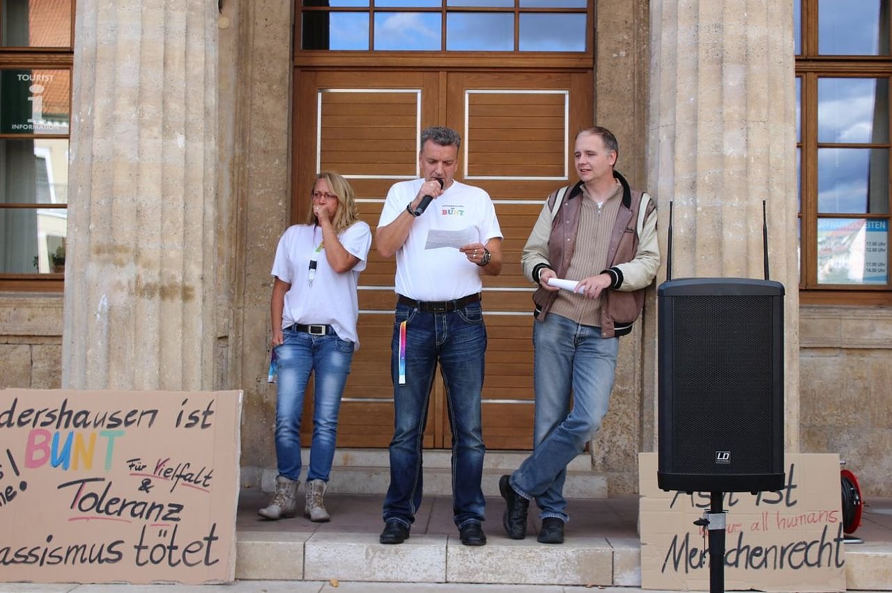 Unter den Teilnehmern der Kundgebung waren neben Bürgern aus Sondershausen auch Teilnehmer aus Sömmerda angereist, um Solidarität auszudrücken. Der evangelische Kirchenkreis wollte eigentlich um 17:00 Uhr eine Beratung durchführen und änderte den Plan und nahm an der Kundgebung teil.