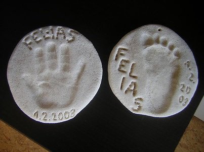 Am Montag wollen wir etwas ganz besonderes machen. Wir verewigen unsere Handabdrücke in selbstgemachten Salzteig.Nachdem die Namen in den Teig geschrieben wurden und die Handabdrücke wunderbar gelungen sind, kommen die fertigen Formen für ein paar Stunden in den Backofen. Am nächsten Tag können diese dann farblich gestaltet werden.