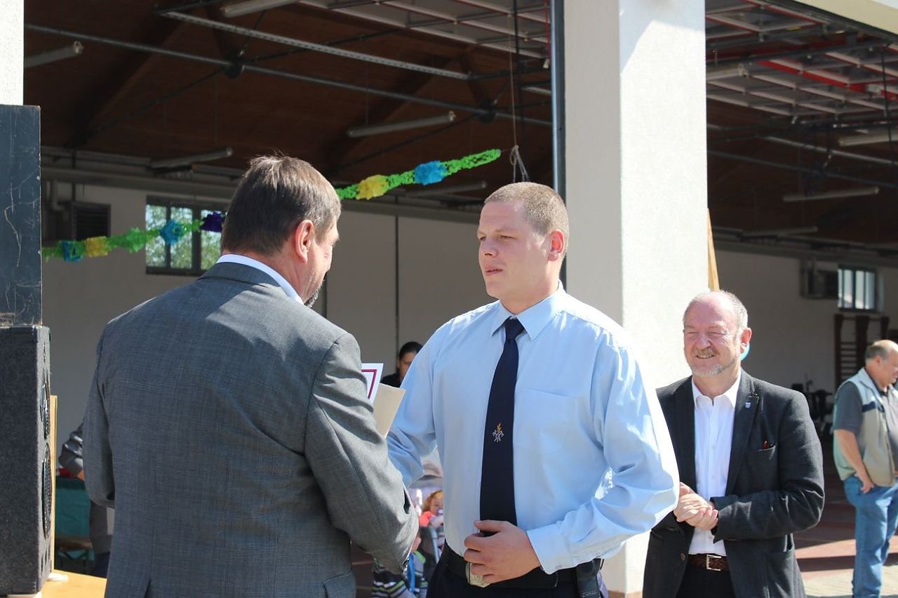Nach den Auszeichnungen gab es noch eine Beförderung für Kamerad Marco Meske, der Oberfeuerwehrmann wurde. Zu den ersten Gratulanten gehörten neben Kreyer, Wreden und Degenhardt auch Lantagsmitglied Manfred Scherer (CDU) und die ersten Beigeordnete des Bürgermeisters, Cornelia Kraffzick (SPD), sowie Gäste befreundeter Wehren aus Berka, Koblenz und Muckran.