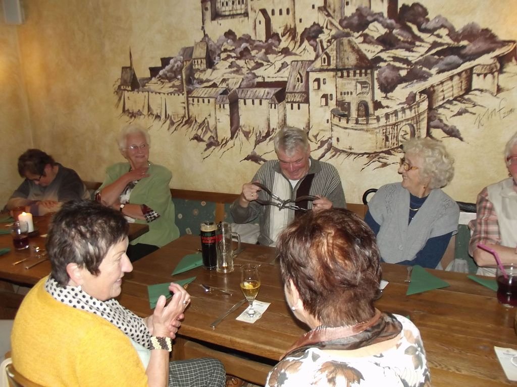 In Abwandlung eines Ritteressens hatte ich ein Drei Gänge Menü für unsere Senioren und Gäste vorbestellt. Als Vorspeise wurde eine köstliche, frische Kartoffelsuppe mit Croutons gereicht, als Hauptgang Tafelspitz mit Sahne-Meerrettich Soße, Kartoffeln und knackigem Bohnengemüse und als Dessert gab es Mango Sorbet an frischen Früchten mit Sahne. Es mundete allen köstlich. Ein ganz großes Lob an den Küchenchef und seine Helfer. Dazwischen immer wieder Unterhaltungseinlagen, Scherze, Späße. Natürlich wurde nach dieser köstlichen Völlerei ein Fruchtlikör als Absacker und Verdauerli gereicht.