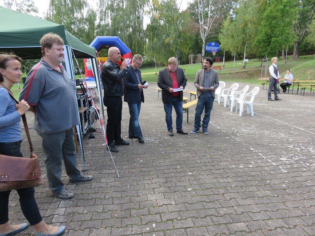 Bei herrlichstem Herbstwetter waren viele Einheimische und Flüchtlinge in die Steile Hohle 5 gekommen. Gegen 15.00 Uhr eröffnete der Vereinsvorsitzende Werner Bank, der gleichzeitig die akustische Beschallung übernahm.