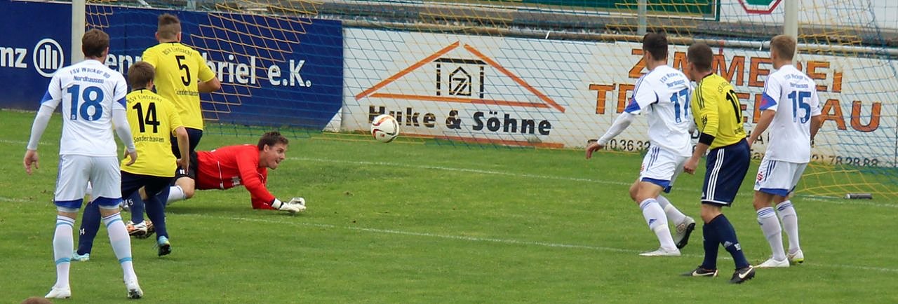 In der 2. Halbzeit brach dann das Gewitter über die Sondershäuser herein. In der 57. Minute eröffnete Jan Mogge den Reigen. Gleich in der 60. Minute legte Kevin Nennhuber für die Nordhäuser nach. Bis zur 73. Minute ging es gut und Michel Harrer legte nach. Und ein Doppelschlag von Pierre Dominik Becken (83. und 86. Minute) beendete den Torreigen.