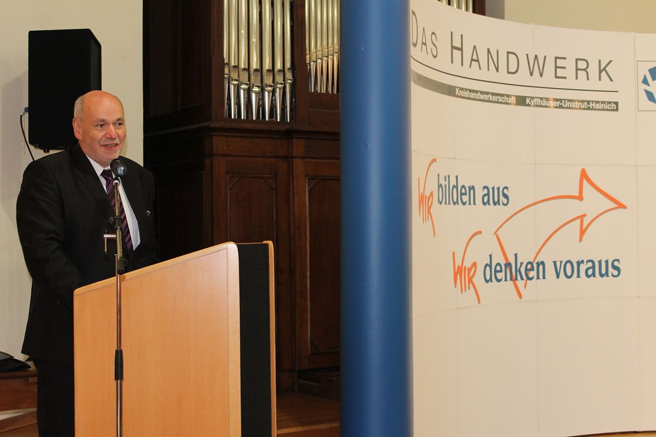 Die Eröffnungsrede übernahm Kreishandwerksmeister Roland Reichenbach. Anlässlich des 25- jährigen Bestehens machte er einen Rückblick in die Geschichte, wie es vor 25 Jahren mit 11 Innungen begann. Über die Station Sondershausen / Artern bildete sich am 27.6.2001 die Kreishandwerkerschaft in der jetzigen Form mit 22 Innungen und 760 Mitgliedsbetrieben.