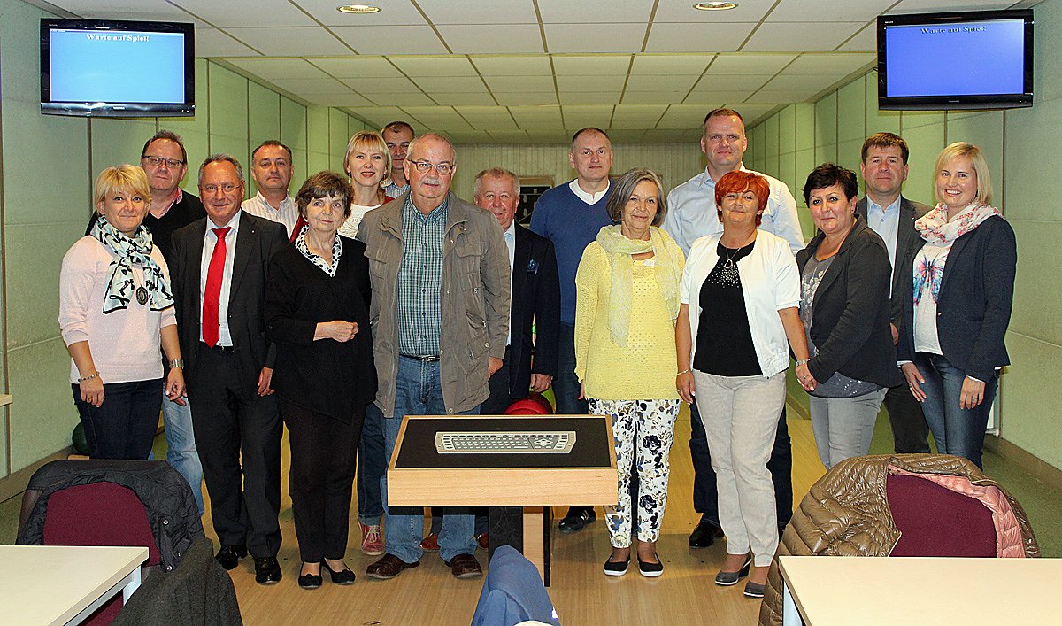 Am Abend gab es Entspannung auf der Bowling-Bahn im Ferienpark Feuerkuppe auf dem Straußberg bei Sondershausen. Hier gratulierte der Landrat mit einer improvisierten Torte einem Delegationsmitglied zum Geburtstag, unter ihnen als Delegationsbegleiter Verwaltungsleiter Dr. Heinz-Ulrich Thiele und Sparkassenvorstandsvorsitzender Ulrich Heilmann, der zwischen den einzelnen Einsätzen beim Bowling gleich Kontakte knüpfte.