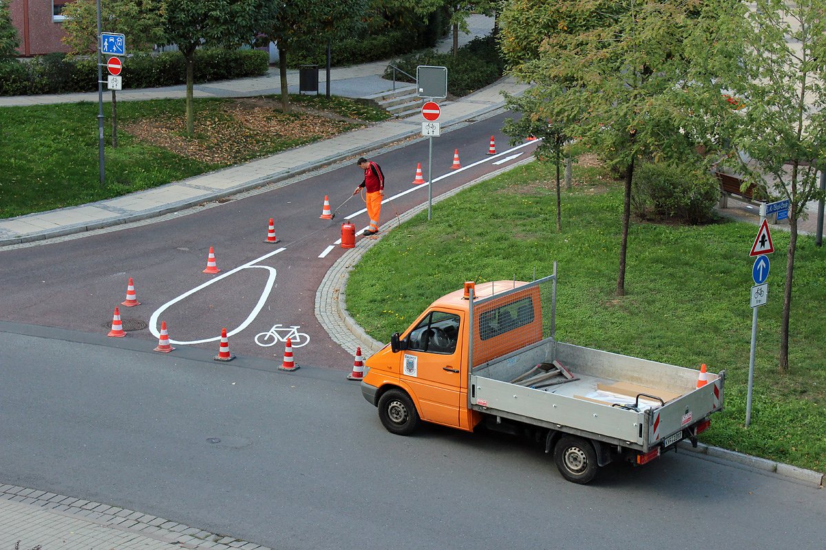 Heute war es soweit, der Bauhof der Stadt Sondershausen brachte die entsprechenden Fahrbahnmarkierungen auf, damit die Linksabbieger auch rechtzeitig vor den entgegenkommenden Radfahrern gewarnt werden. Besser jetzt die Maßnahme umsetzen, bevor mal ein Radfahrer auf der Frontscheibe eines Pkw landet.