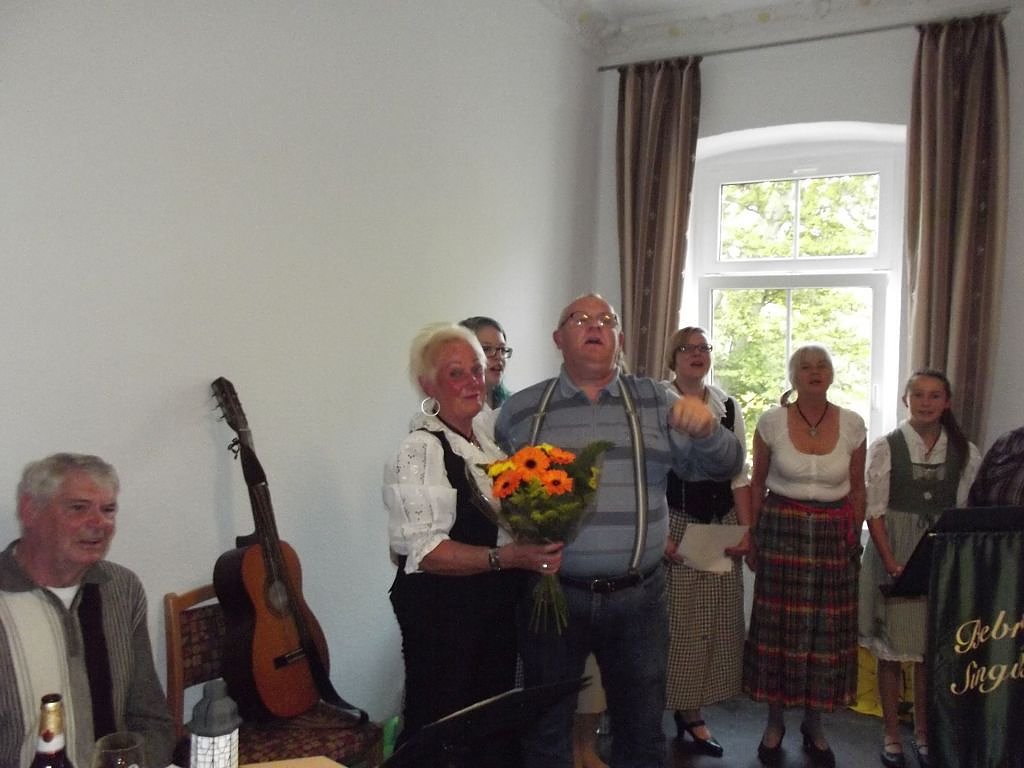 Dann hatte Thomas Leipold noch eine Überraschung parat. Helga Marx, seit nun schon 18 Jahren bei den Singvögeln nicht nur dabei, sondern auch textend und dichtend immer überraschend mit neuen Sachen und Aufführungen aufwartend, hatte letzte Woche einen besonderen Geburtstag. Sagen wir einmal, es wäre der Fünfunddreißigste. Also brachten wir vom WB 4, gemeinsam mit den Singvögeln der Jubilarin mal ein Ständchen und überreichten einen schönen Blumenstrauß. Als kleines Abendmahl wurde selbst gemachter Kartoffelsalat mit Boulette und Beilage gereicht. Es mundete prächtig.