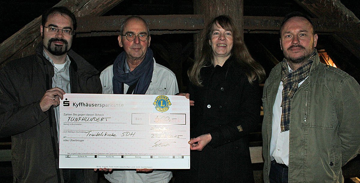 Um dort hin zu kommen, musste man bis fast unter das Dach klettern. Pfarrerin Cornelia Bickelhaupt und Klaus Stollberg vom Gemeindekirchenrat führten Jens Schmidt (li.) und Detlef Kuhnert (re.) vom Lionsklub Sondershausen in die Höhe der Kirche. Im Gepäck ein großer Scheck.