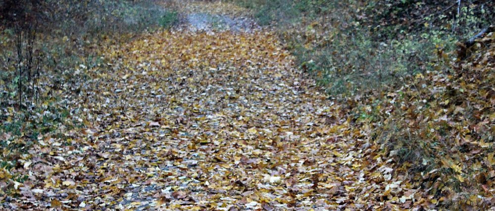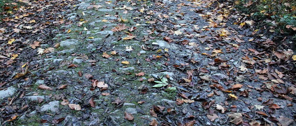 Hier ist keine Kehrmaschine im Einsatz, die mal schnell das Laub wegmacht. Hier geht es erst wieder, wenn ein Frost das Laub ausgetrocknet hat und der Wind es vom Weg geblasen hat. Bis dahin heißt es aufpassen!