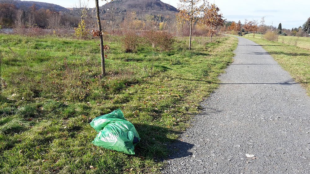 Hier wurden mal wieder in einem Müllsack offensichtlich alte Pflanzgefäße entsorgt. So weit ja noch ganz gut. Muss man aber seine Mülltüten unbedingt auf dem Wipperdamm nahe der Kiesgrube ablegen. Wer macht sich die Müh (Foto: Karl-Heinz Herrmann)">