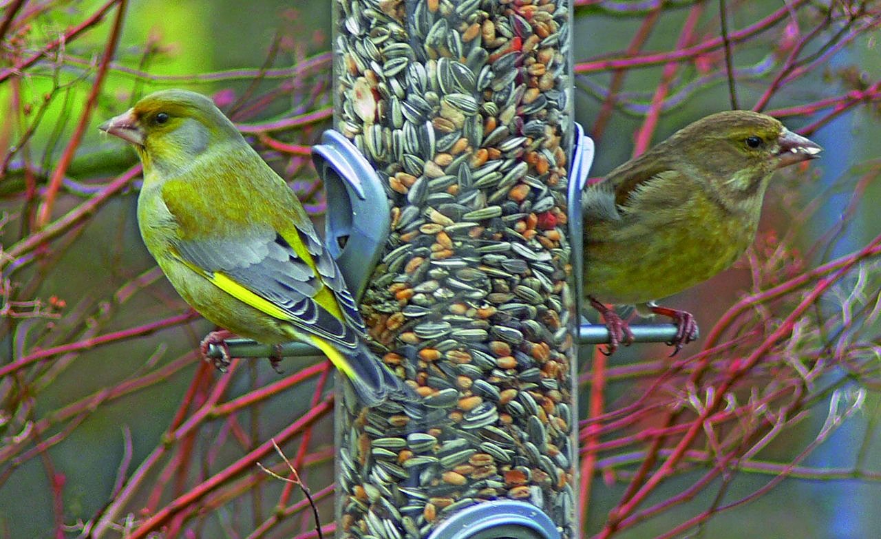 Zwei Grünfinken am Futtersilo (Foto: Ingo Ludwichowski)