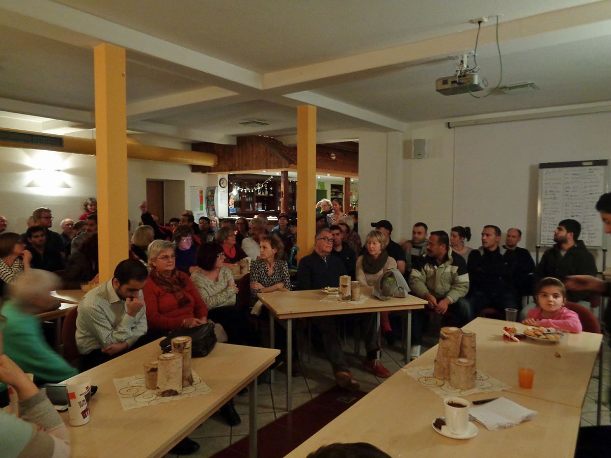 Und so konnten alle Gäste erfahren, dass Emad, wie viele seiner Landsleute auch, erst die Flucht ergriff, als er direkt vom Krieg betroffen und sein Haus zerbombt war. Nur nachdem Emad sein restliches Hab und Gut zu Geld machte, war ihm die Flucht nach Deutschland überhaupt möglich. Der Fluchtweg, vor allem mit dem Schlauchboot, gestaltete sich gefährlich, zumal er die Verantwortung auch für seine Frau sowie seine 5- und 7-jährigen Kinder hatte.