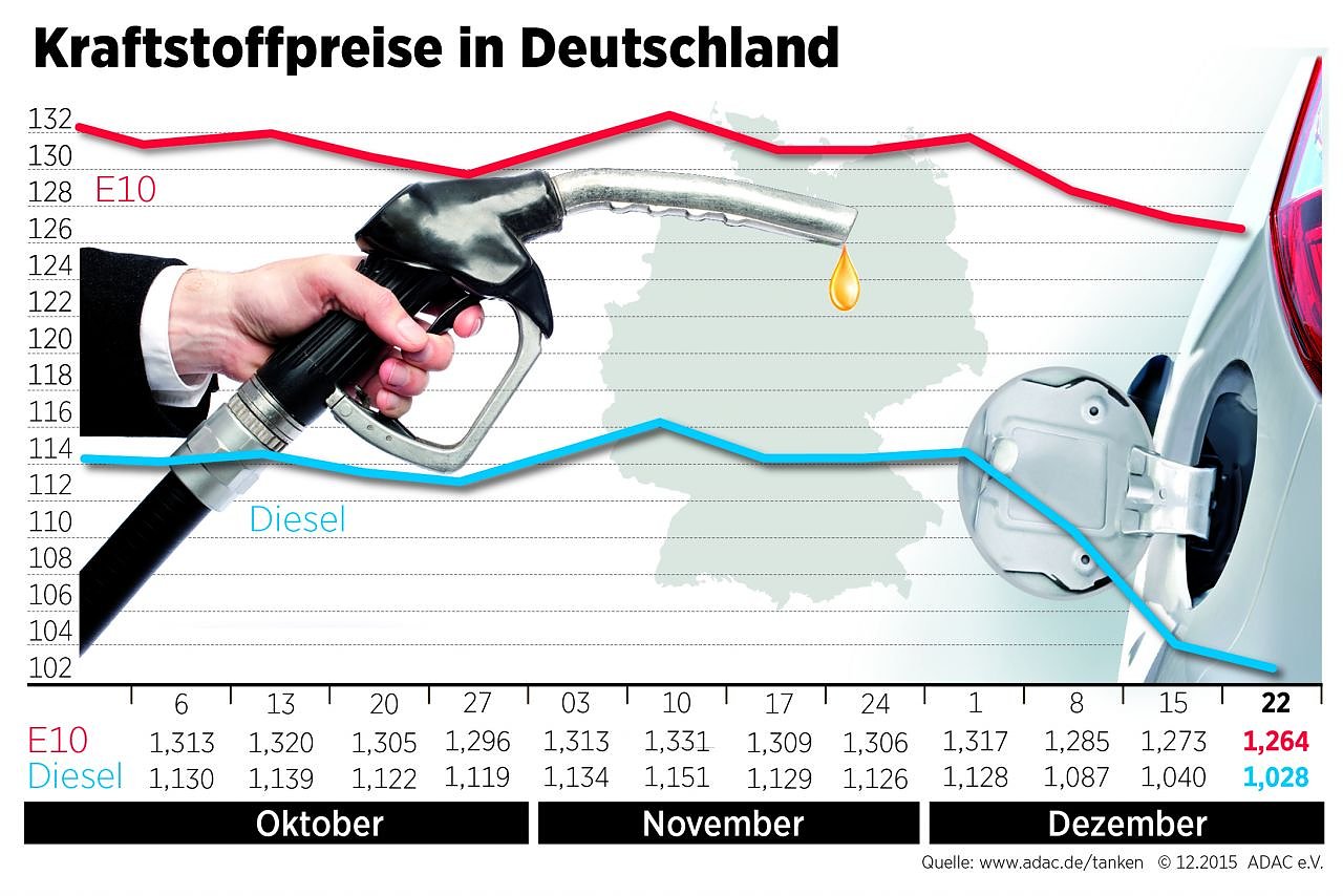 Der gleiche Trend ist bei Super E10 zu beobachten: Ein Liter kostet im Schnitt 1,264 Euro. Das ist ein Minus von 0,9 Cent gegenüber der Vorwoche.