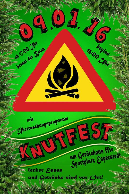 Wir starten unser nächstes Knutfest am 09. Januar 2016 auf dem Sportplatz in Jechaburg bereits um 17 Uhr. Wer mit Weihnachtsbaum kommt, erhält ein Glühwein gratis. Die Versorgung sowie die Unterhaltung ist abgesichert. Der Heimat und Geschichtsverein Freut sich über viele Gäste mit guter Laune.