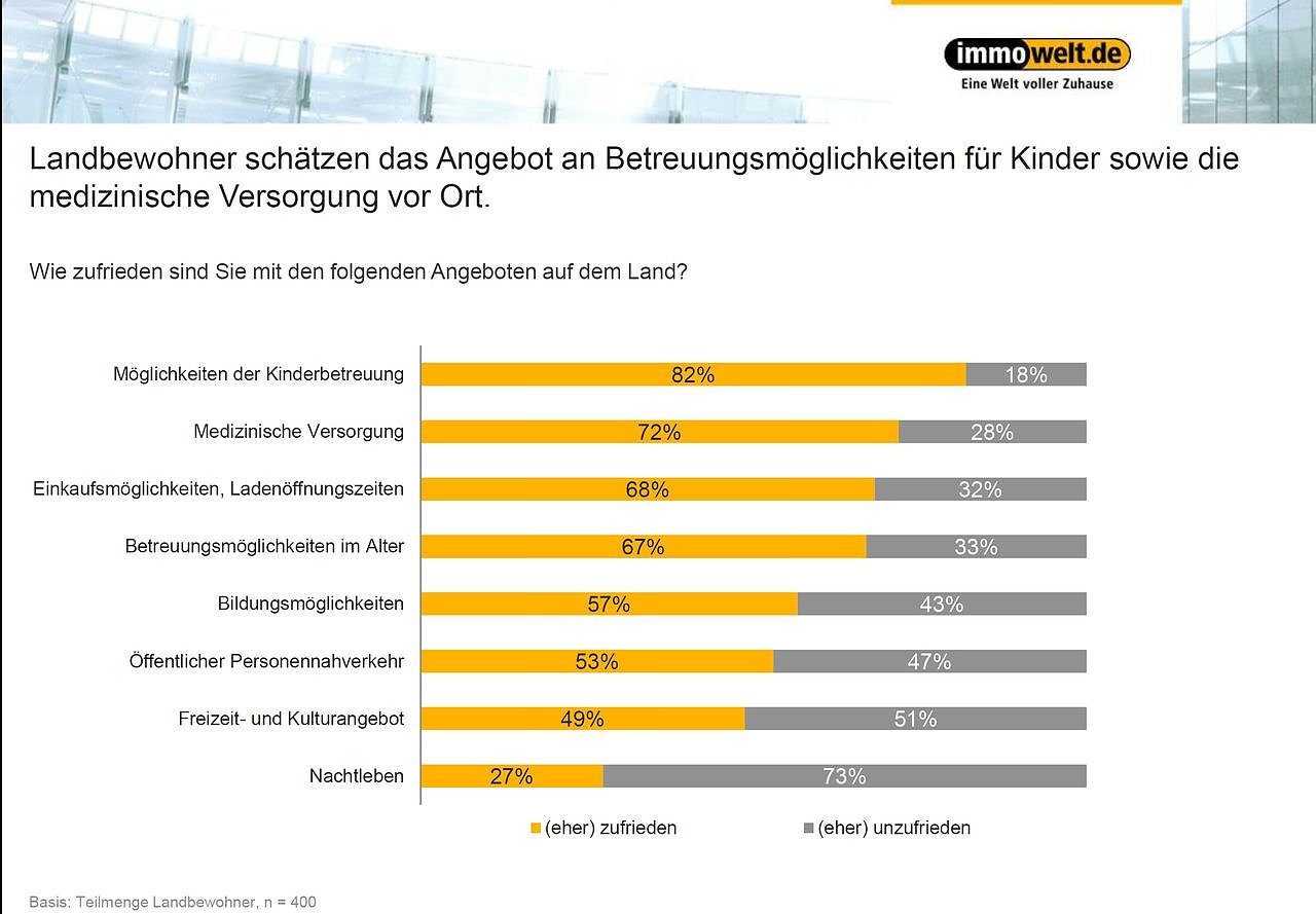 Nachholbedarf sehen die Landbewohner allerdings beim Nachtleben: Lediglich gut ein Viertel der Befragten (27 Prozent) ist mit den Ausgehmöglichkeiten vor Ort zufrieden. Auch das Freizeit- und Kulturangebot schneidet mit einer Zufriedenheit von 49 Prozent nicht ganz so gut ab. Etwa die Hälfte der Befragten ist mit dem öffentlichen Personennahverkehr (53 Prozent) und den Bildungsmöglichkeiten (57 Prozent) zufrieden.