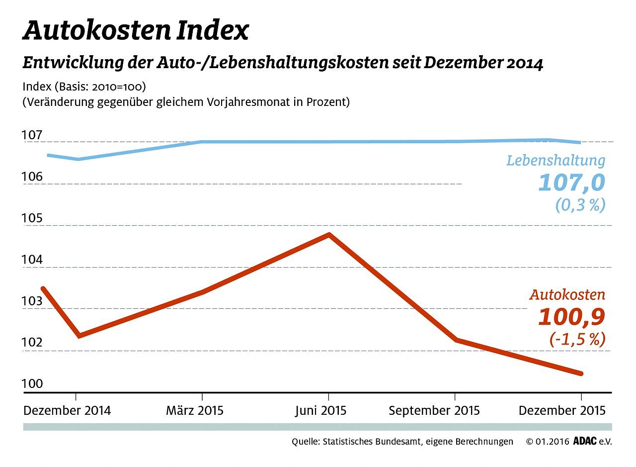 Vergleicht man die Teuerungsraten vom Dezember 2015 mit den entsprechenden Werten des Vormonats, ergibt die Auswertung ein anderes Bild. Der Kraftfahrerpreis-Index lag im vergangenen Monat um 1,5 Prozent unter dem Wert vom Dezember 2014, ausgelöst in erster Linie durch die gesunkenen Kraftstoffpreise. Sie fielen zwischen Dezember 2014 und Dezember 2015 um 7,5 Prozent und sind mit 90,2 Punkten derzeit sogar um knapp zehn Prozent niedriger als im Basisjahr 2010. Bei den allgemeinen Lebenshaltun