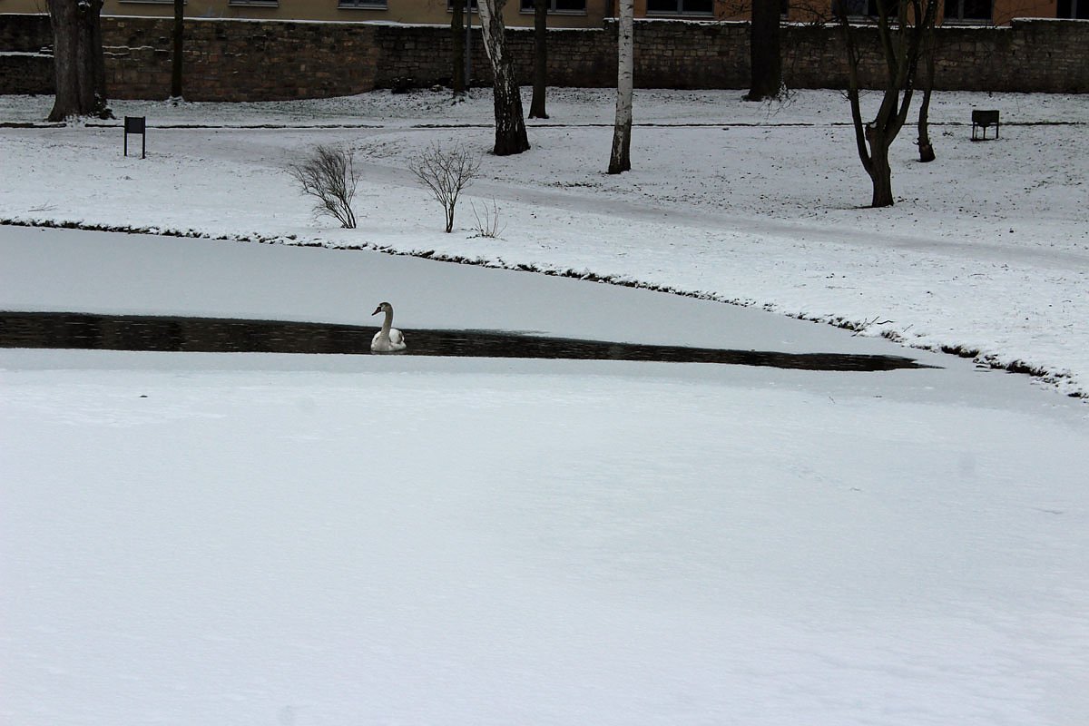 Auch die Wipper macht noch keine großen Anstrengungen, um schon zu zufrieren. Auch wenn das Füttern der Tiere an den beiden Parkteichen verboten ist, so gibt es auch jetzt noch genügend Leute, die dem Schwan altes Brot oder Brötchen zu werfen. Verhungern wird er nicht, da ist sich Dr. Fruth sicher.