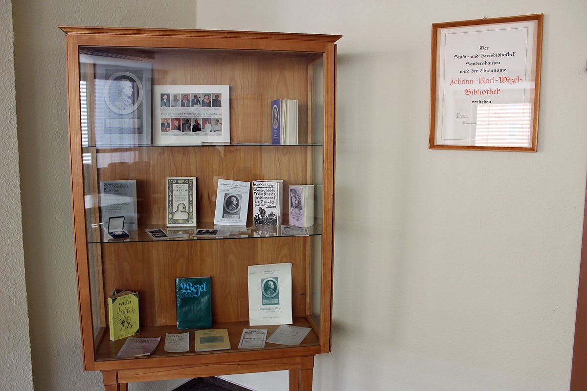 Im Veranstaltungsraum der Stadtbibliothek ist eine ganze Vitrine für Johann Karl Wezel eingerichtet worden, mit vielen Dokumenten. An den Wänden hängen Bilder des ehemaligen Wezel-Hauses (bevor es zu DDR-Zeiten abgerissen wurde), bzw. der Namensurkunde. Natürlich sind in der Bibliothek auch die verschiedenen Wezel-Bände einsehbar, was an anderer Stelle nicht möglich wäre oder zusätzliche Wege beinhaltete.