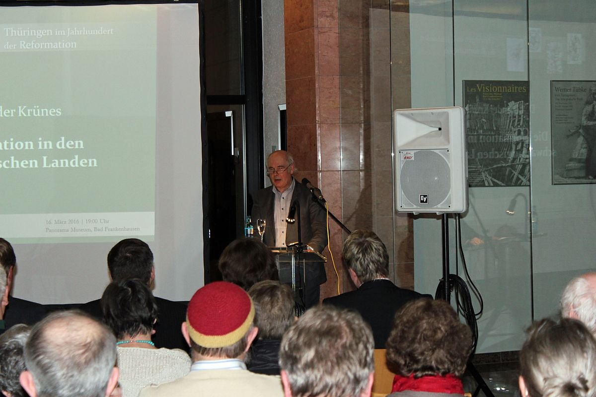 Im Rahmen der Reformationsjubiläumsfeierlichkeiten präsentierte das Panorama Museum in seiner Studiogalerie zu ungewohntem Zeitpunkt diesen Vortrag, und Hans-Joachim Warnecke Vorstandsmitglied der Kyffhäusersparkasse Artern-Sondershausen freute sich bei der Begrüßung dass bis auf einzelne Restplätze die Eingangshalle gefüllt war. Es ist bereits die 16. Veranstaltung in dieser Reihe und sechs folgen noch, so auch noch in Nordhausen.