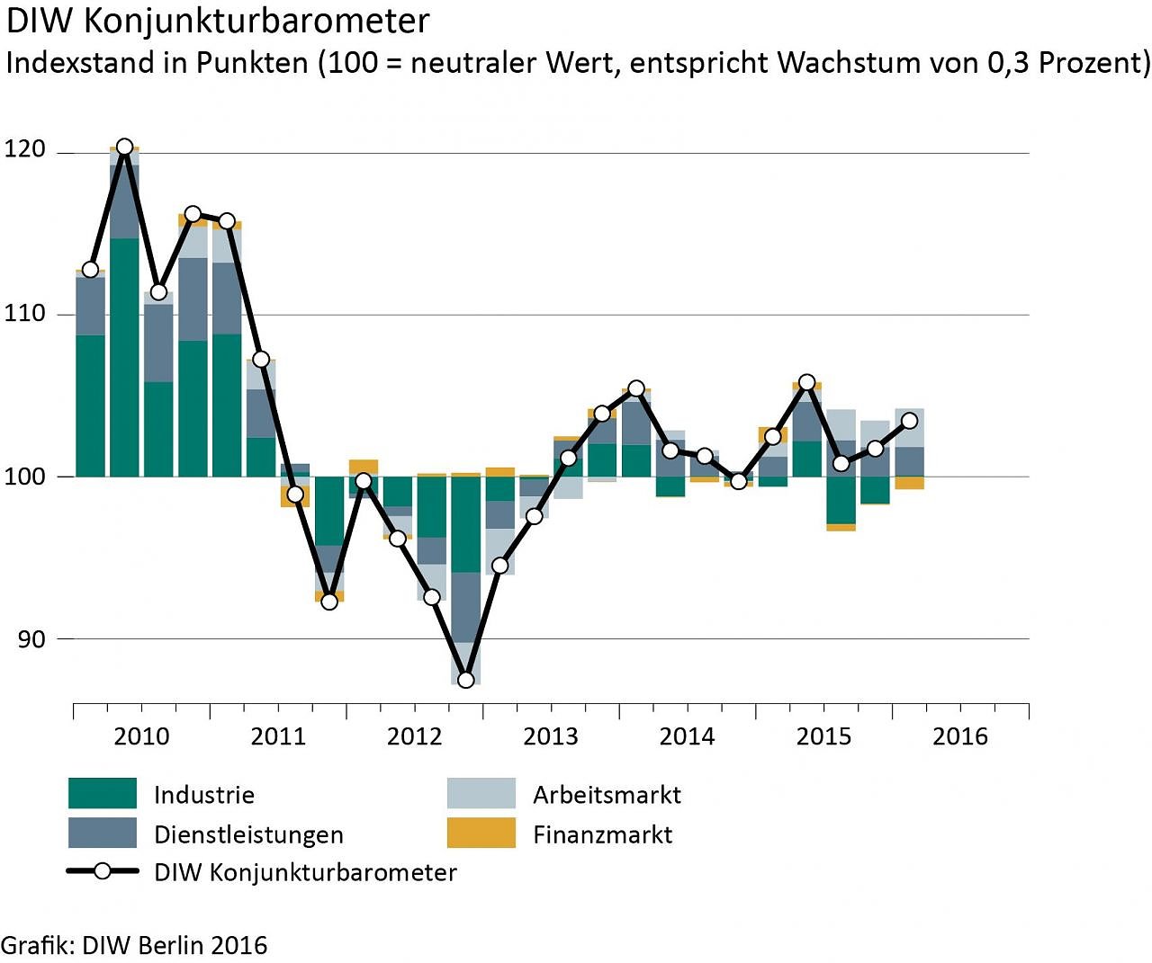Die deutsche Wirtschaft dürfte mit einem kräftigen Plus in das Jahr gestartet sein: Das Konjunkturbarometer des Deutschen Instituts für Wirtschaftsforschung (DIW Berlin) signalisiert für das erste Vierteljahr 2016 einen Anstieg des Bruttoinlandsprodukts um 0,5 Prozent gegenüber dem vorangegangenen Quartal...