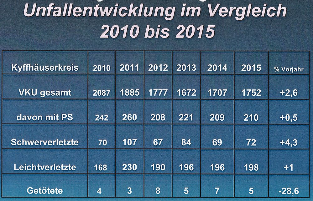 In der Polizeiinspektion Kyffhäuser (PI) in Sondershausen wurde heute die Verkehrsunfallstatistik 2015 für den Kyffhäuserkreis vorgestellt. Hier die ersten Übersichtszahlen...