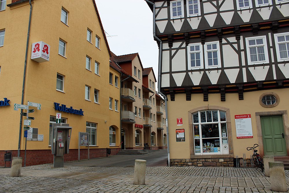 An der Touristinfo gabelt sich der Lutherweg. Der Hauptweg geht weiter in Richtung Schloss und dann weiter in Richtung Günserode Bilzingsleben. Ab der Touristifo ist ein Stichweg bis zum Panoramamuseum ausgeschildert.