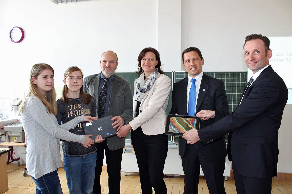 Symbolisch erhielten Lisa und Collin im Beisein von Schulleiter Ingo Woythe, Landrätin, Antje Hochwind, Mario Weber (Partner Business Manager bei HP Deutschland) und Axel Harzendorf Accout Manager bei der Bechtele GmbH Weimar, die Tablets überreicht.