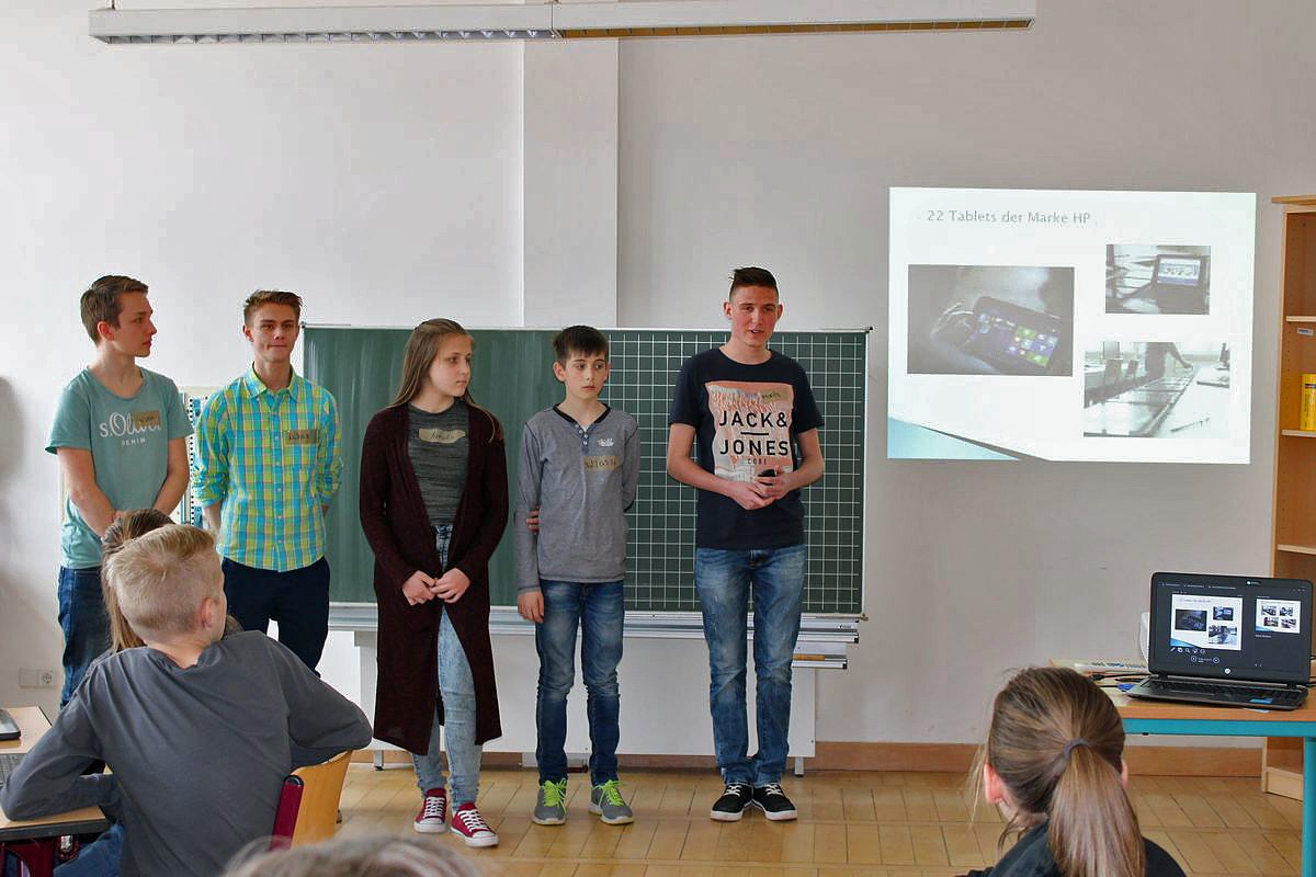 Fabian Schlufter, Lukas Steinmetz und Moritz Reimer (re.) aus der 11. Klasse unterstützen mit einer Projektarbeit die Arbeit in der Klasse 6a. Amalia und Niklas aus der 6a äußerten sich begeistert. Nikals gefiel besonders die vielen Möglichkeiten mit Powerpoint. Denn auch wenn heute die offizielle Übergabe war, man war natürlich schon mit den Geräten etwas vertraut. Die drei Schüler aus der 11. Klasse wollen ihre Projektarbeit im Herbst fertigstellen und sie soll im Januar verteidigt werden. Weber und Harzdorf wollen dann im Januar teilnehmen. Zum Dank für die Unterstützung erhielten die drei von Frau Ehrenberg Kinokarten überreicht.
