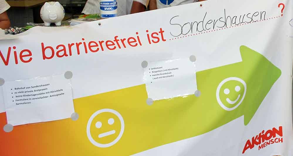 Auf einem großen, skalierten Pfeil in Richtung Barrierefreiheit können die Teilnehmer mit Klebepunkten markieren wie weit Stadt Sondershausen auf dem Weg zur Inklusion ist. Ein Städtetest ergänzt die Aktion. Interessierte gehen auf Tour, um zentrale Bereiche in Sondershausen anhand von 15 Fragen auf Zugänglichkeit für alle zu testen.