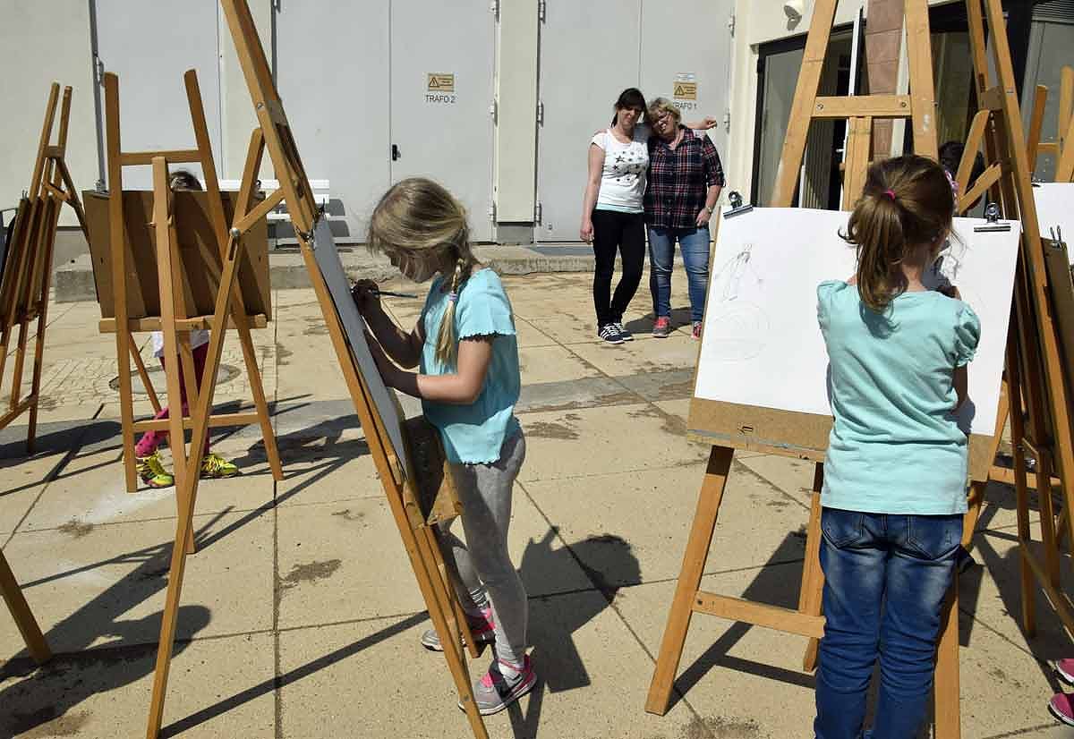 Also folgte die Frage, wovon die Kinder am Sonntagmorgen geweckt werden. Ihre Vorschläge sind dann doch sehr heiter: Vom Wecker!, ein Junge: Von meiner kleinen Schwester! Natürlich sind da noch Papa, Mama und der Verkehrslärm, als ein Mädchen ruft: Die Glocke vom Bürgermeister! Nun war es nur noch ein kleiner Schritt bis zur Kirche. Die Frage nach dem schwarzbekleideten Berufsstand, also nach den Leuten, die dort sonntags die schönen Geschichten aus der Bibel vortragen, wurde folgerichtig mit Schornsteinfeger beantwortet. Die Antworten der Kinder spiegeln eben ihre Lebensrealität. Nachdem sie dann noch etwas über den Maler Werner Tübke erfahren hatten, ging es endlich zum Panorama-Gemälde. Zusammen mit dem Museumspädagogen, der ganz viel erzählte, wanderten sie eine Runde entlang an der Balustrade und betrachteten dabei Ritter, Bauern, Narren und allerlei gruslige Fabelwesen. Danach begann der praktische Teil im Hof vor der Museumspädagogik.