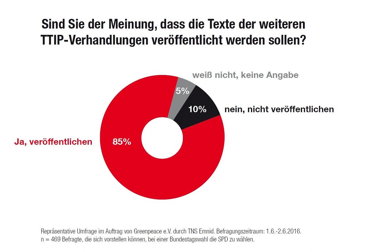 Beim bekannteren Abkommen TTIP hingegen sprechen sich bereits 75 Prozent gegen TTIP oder für Neuverhandlungen aus. Gegen die Haltung der Partei-Spitze protestieren 50 Greenpeace-Aktivisten beim heutigen SPD-Parteikonvent und umrunden mit einem 240 Meter langen Bannerstreifen die gesamte Berliner Parteizentrale. Der rote Streifen ist bedruckt mit Prinzipien aus den SPD-Beschlüssen wie Umweltschutz und Demokratie.