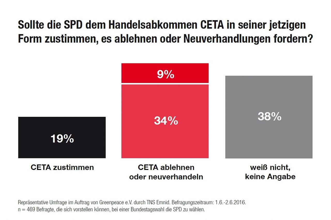 Demnach wollen 43 Prozent der potentiellen SPD-Wähler CETA abgelehnt oder neuverhandelt sehen. Auffällig ist, dass 38 Prozent keine Angabe machen konnten. Seit Beginn der CETA-Verhandlungen vor sieben Jahren ließ die SPD diese Wählerschaft offenbar in Unwissenheit.
