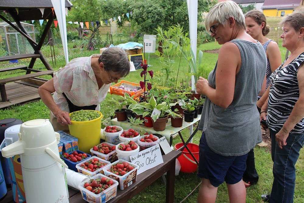 Die Vereinsmitglieder hatten einiges vorbereitet. Selbst gezogenes Bio-Obst, Kaffee und selbst gemachter Kuchen standen bereit. Allerdings war der Zuspruch um 14:00 Uhr noch etwas schwach. Ein kurzer Regenschauer zuvor und das schwülwarme Wetter hatte doch einige Gäste abgehalten zu kommen.