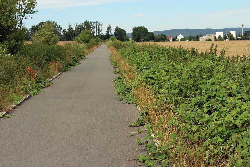 Die waren beim Bau stark zurück geschnitten worden und treiben jetzt um so stärker wieder aus. Die Brombeeren könnten zwar schmackhaft sein, aber die Ranken werden irgendwann sehr stachlig. Und die Hauptwachstumsphase ist gerade jetzt. Hier werden die Stadt Sondershausen aber besonders aber die Gemeinde Kyffhäuserland sich etwas einfallen lassen müssen, damit die Ranken nicht zu schnell sich in den Weg schieben. Bei weichen Reifen könnte sich bald die ersten Stacheln einbohren.